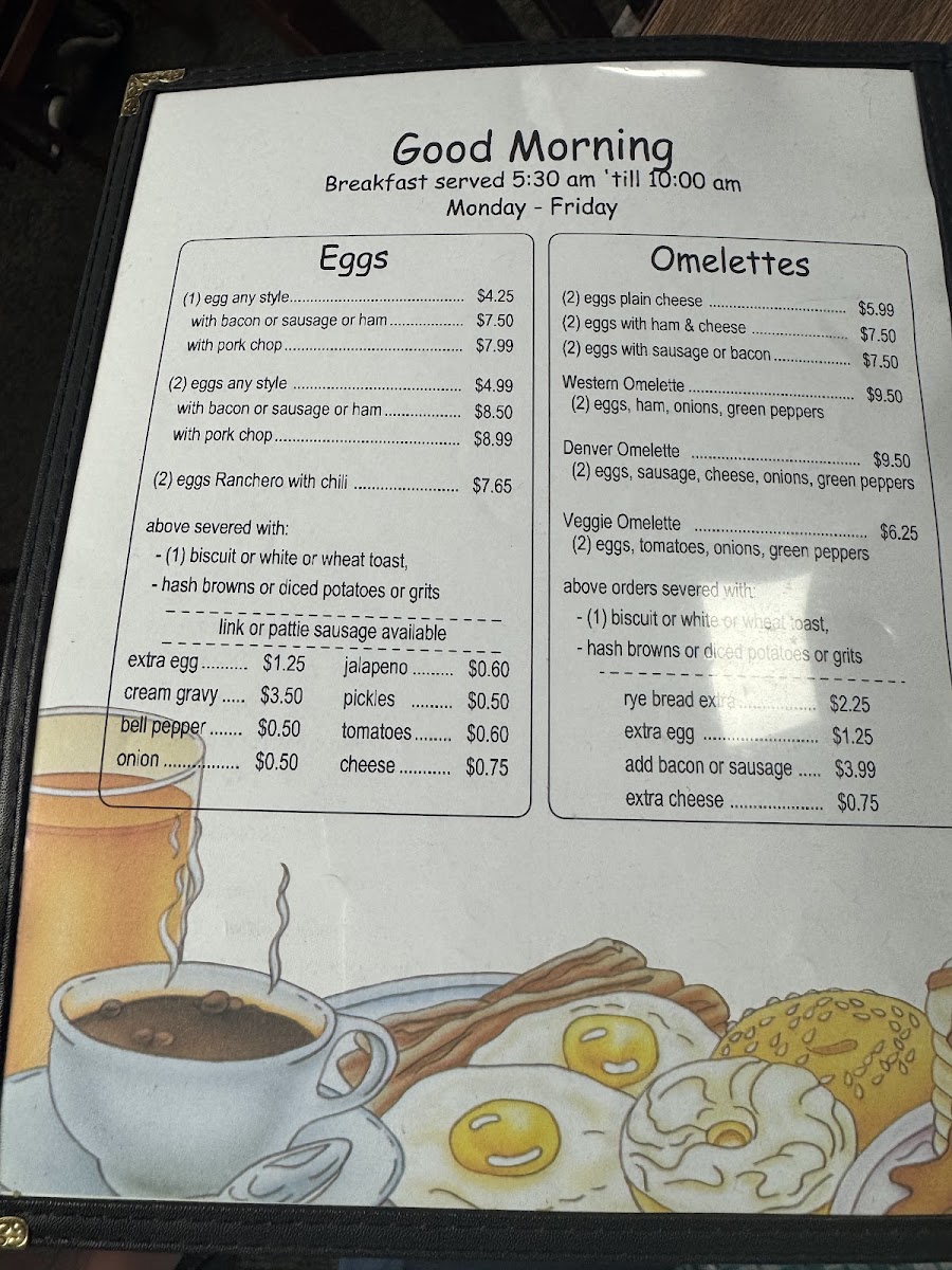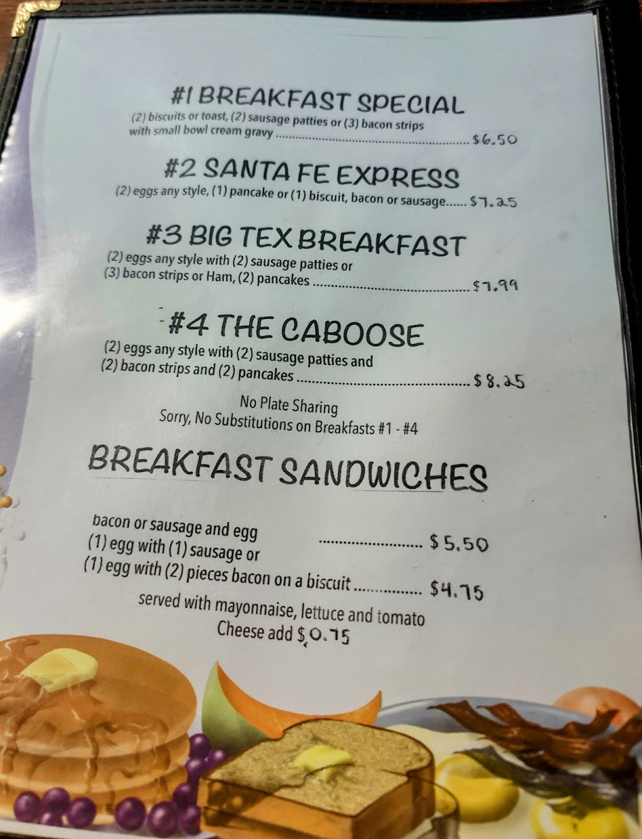 Santa Fe & Sp Cafe offers a delightful variety of comfort food, making it a perfect spot for breakfast or brunch in Brenham. The menu features classic favorites with a homey, satisfying twist. A standout is the Pork Chop, cooked to perfection and paired with a side of savory goodness. For those who prefer a more traditional breakfast, the Scrambled Eggs are fluffy and well-seasoned, complementing any dish on the menu. The Classic Breakfast is a hearty choice, featuring all the essentials like eggs, bacon, and hash browns, ensuring a fulfilling start to the day. If you're in the mood for a bit of indulgence, the Overeasy Eggs are a great option, offering a runny yolk that pairs beautifully with crispy bacon and Pancakes. The combination of Bacon, Sausage, and Hash Browns brings together the best of both worlds, providing a perfect balance of savory flavors. Each dish is crafted with care, making Santa Fe & Sp Cafe a local gem for satisfying, flavorful meals that never disappoint.